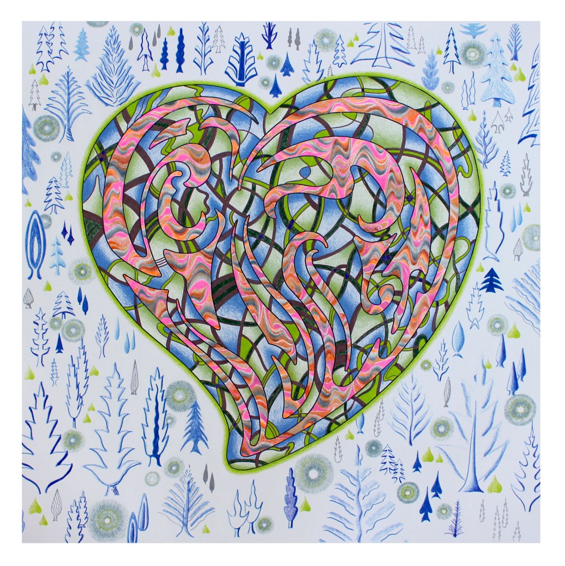 Image: John DeFaro. Moving Heart ‘Green Day’. 2020. ink, pencil, watercolor on acid-free archival paper. 24 by 24-inches. Collection of the artist.