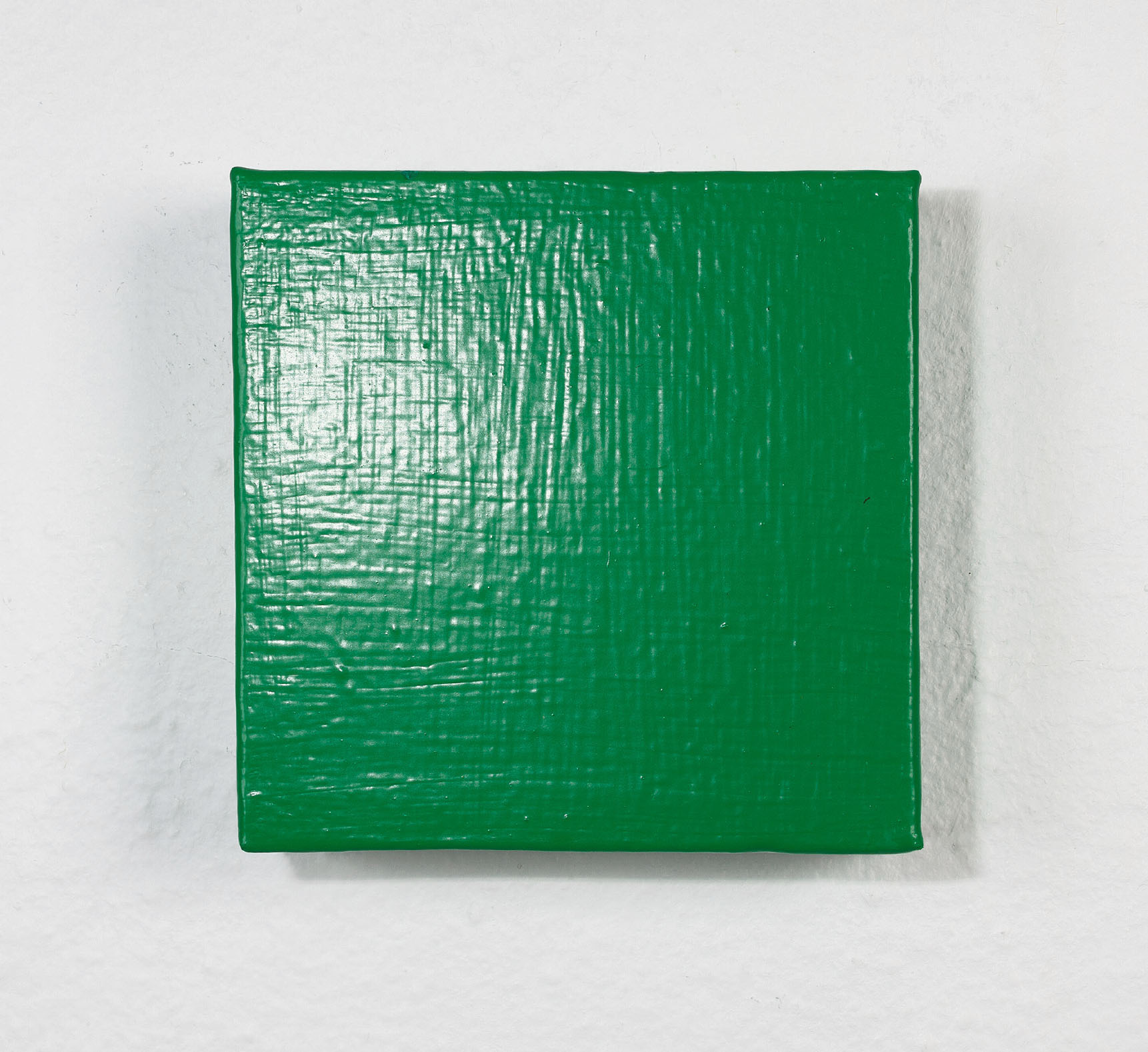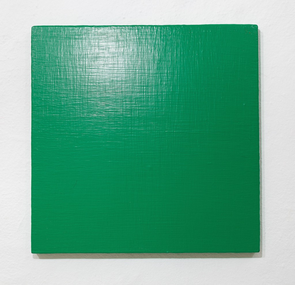 My Green Painting. 2023. 37 layers of acrylic with short clips of human hair within. Each layer applied in opposite directions.