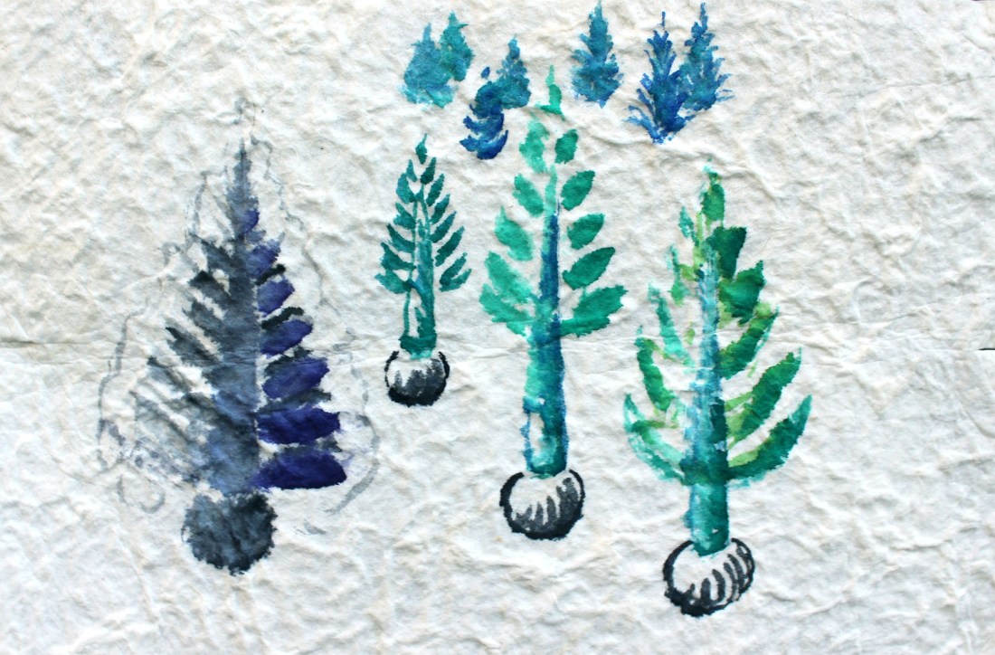 John DeFaro. Trees. 2018. ink, watercolor on Crane’s cotton paper. 10 by 5 inches.